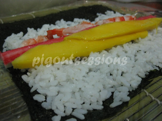 For my first sushi attempt, I put in some sliced mango, crab meat slices, and a generous amount of Japanese mayo. You can use the ordinary kind of mayo, but sushi tastes best if you use Japanese ingredients.