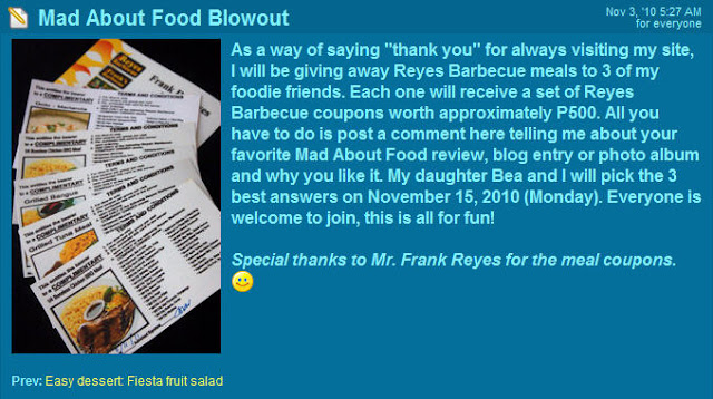 Hey guys! Ms. Joy Cruz, the author of the sumptuous food photo blog, MAD ABOUT FOOD is having a food blowout! At stake are free Reyes Barbeque coupons worth Php 500.00 each to 3 very lucky foodies!
