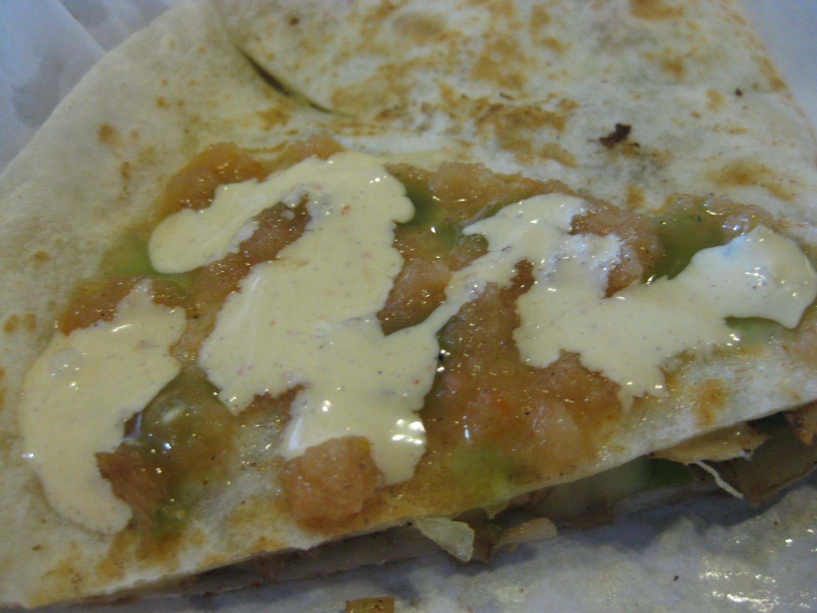 After eating through the 3 slices, I even had a hard time finishing my last piece. This is where "looks can be deceiving" sound good. As you can see, I like my quesadilla dripping with lots of hot sauce which isn't readily served with the food but you can find in their condiments area. :)