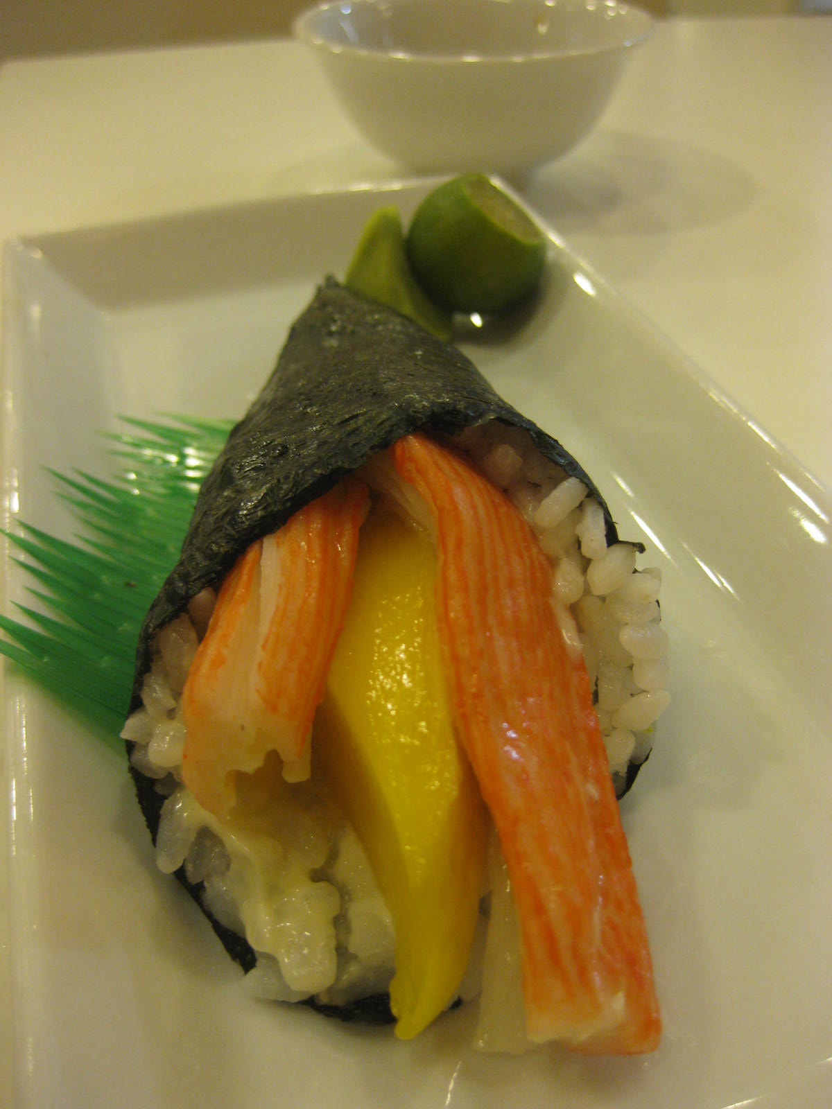 We finally finished our meal with a wonderfully good Temaki. For something as cheap as this, it's actually really worth your money. Oozing with chunks of ripe mango, crab sticks, sticky rice (I do hope it's Japanese) and generously filled with Japanese mayo.