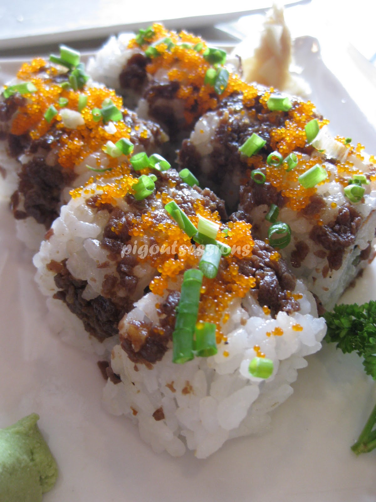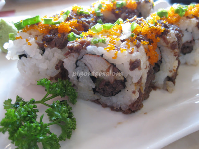 For someone with little appetite, I would suggest you share this with your friend or your date, each roll really fills you up and feels heavy on the tummy. I appreciate how tasty the sirloin steak bits were, but I think it somehow overpowered the other ingredients. I just think it would be better if in every bite you get that wonderful explosion of all the flavors combining in your mouth and somehow bringing you closer to sushi heaven. :)