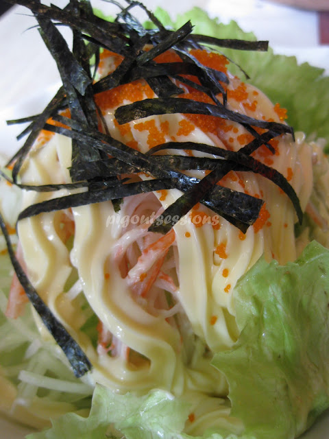 Crunchy cucumber and crab stick salad resting on a bed of fresh and crisp lettuce. Generously topped with Japanese mayo, fish roe (ebiko) sliced nori sheets. This did not disappoint! Everything was definitely fresh and the flavors and different textures mingled harmoniously in every bite. Sure enough, I noticed this as a staple order in the other diner's tables as well.