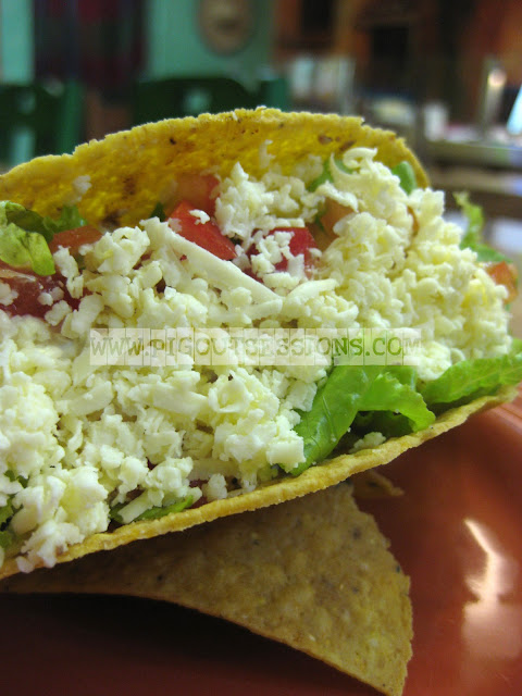 I've seen too many taco posts in the last few weeks that I decided to kill my curiosity and ordered their taco as well! Described in their website as "crispy corn or soft flour folded tortilla with your choice of filling with cheese, refried beans, lettuce, fresh salsa and sour cream." Well, mine came really bursting with fillings!