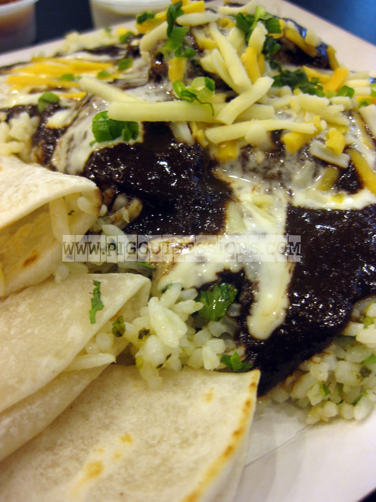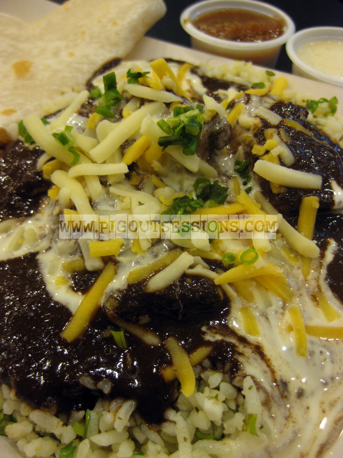 It came with a salsa and garlic dip. I put some of the rice and a huge chunk of chicken on my plate, with the chocolate sauce and plenty of cheese and combined the salsa and garlic dips, and took my first bite not really knowing what to expect.