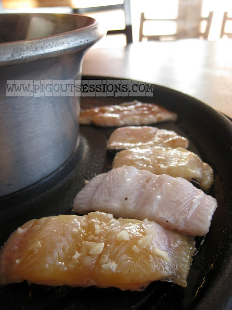 We were asked what kind of soup we wanted. You can choose from Chicken, Spicy Sate, Sinigang, Vegetarian, Kimchi and Taiwan Mala soup.(Or I guess depending on what's available for the day, the Vegetarian, Kimchi and Taiwan Mala weren't mentioned) We chose Sinigang. The waiter will then fill up the center metal bowl of your grill with the soup, the heat is adjustable to your liking and the knob is on the sides of the table. We were also served with butter, for greasing up the grill, or hotplate, whatever is the correct term for it.
