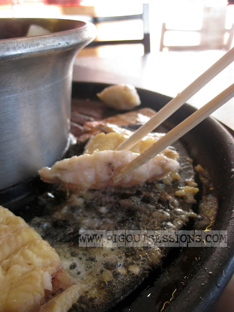 Some went together with the soup, and some went to be grilled. It was hard taking good or even at least acceptable shots because of all the smoke. Plus, make sure that you always grease up your hot plate, otherwise...
