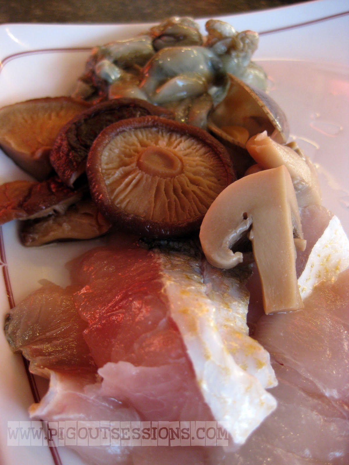 Round 2! Mushrooms,oyster meat, more fish fillets. At this point I had enough of the fish, it was too bony! I'm not sure what type of fish this is as Chum was the one who chose this and of course we didn't have time to jot down notes. :)