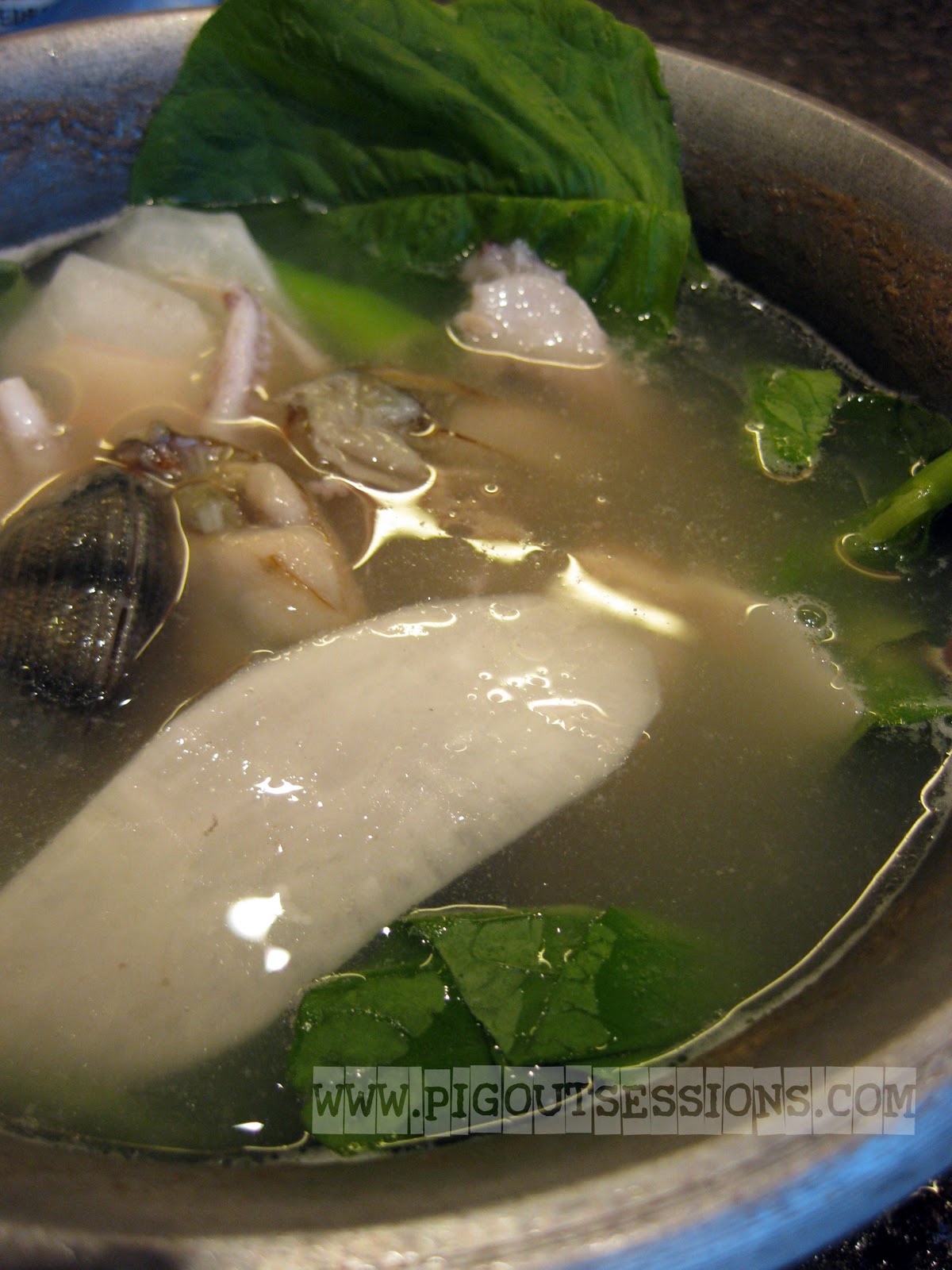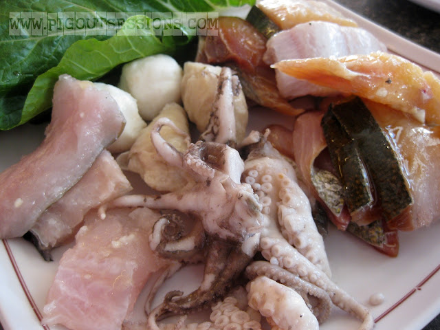 Round 1. BF has got some serious seafood obsession here. He got us assorted fish fillets, squid, squid balls, vegetables.