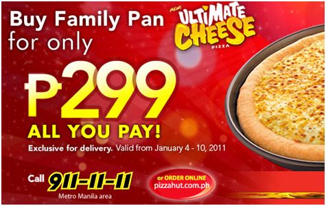 Valid and exclusive for DELIVERY ONLY. For more details you may call 911-11-11 for Metro Manila area or you can also order online through their website at pizzahut.com.ph.