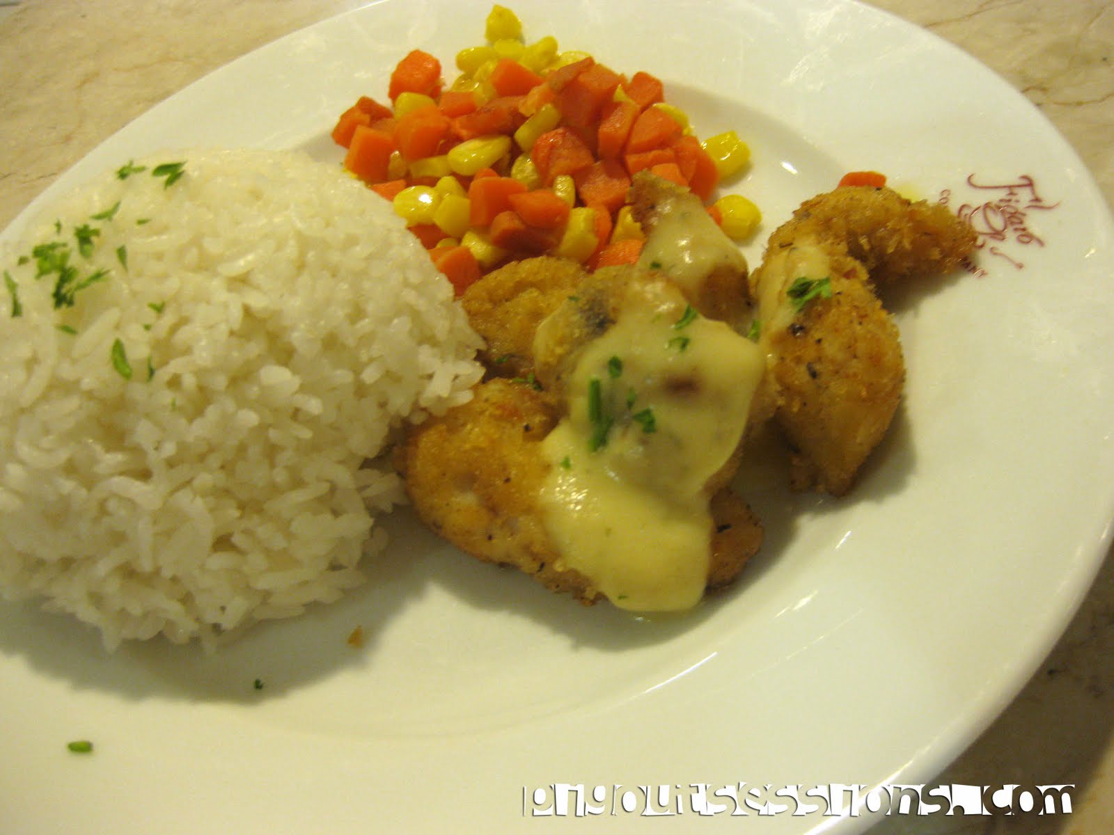 "Deep fried coated chicken fillet poured with creamy cheese sauce. Served with buttered corn and carrots as side dish and steamed rice, it comes with your choice of beverage, iced or brewed coffee or iced tea. Thyme, believed by the ancient Greeks to be a source of courage is also a good source of iron. Though flavorful, thyme does not overpower the taste of chicken. The creamy cheese sauce allows you to savor the crunchy deep-fried chicken with thyme perfect to nourish your body and your metabolism throughout the day. The bursts of flavors from the buttered corn and carrots with the chicken thyme will fill you right after that business meeting or before it at your favorite Figaro Coffee Company."