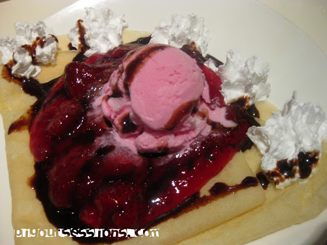 Choco Strawberry Crepe PHP 110.00 or USD 2.49. This was my order and I have to say I didn't liked it that much. The strawberry ice cream scoop literally had pieces of ice inside, they put too much strawberry jam that I had to scrape it off the crepe. I still did got to enjoy my crepe. We loved how the sweetness of the ice cream, syrup and whipped cream is balanced out by the spot on saltiness of the crepe.