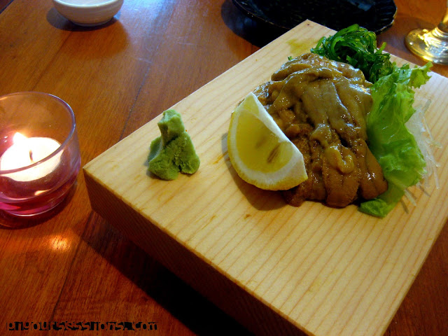 Uni Sashimi. 298.00PHP or 7.09USD approx. This, obviously was Ekai's order which according to her was fresh, buttery and melt in your mouth. I knew I don't like uni sashimi but forgot exactly why, so I tried a sliver. In a nutshell, it was good for me until the aftertaste kicks in (which is why there's a lemon). There's just some things I will never appreciate, oh well.