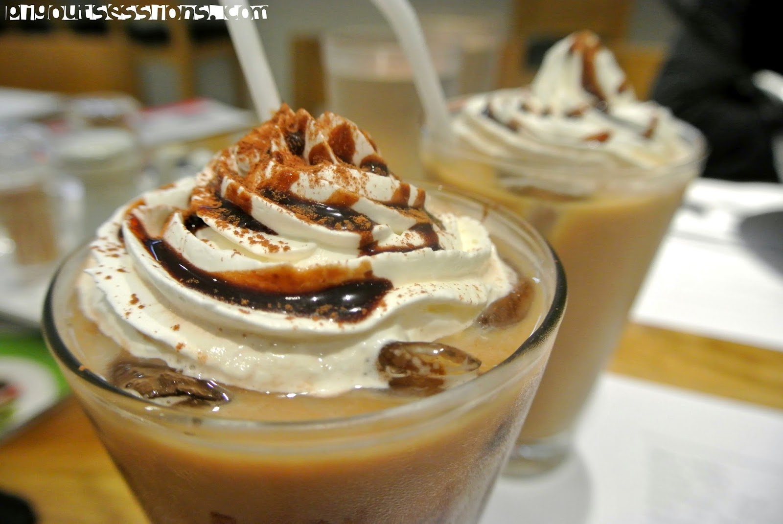 Iced Choco Almod Latte (near foreground) and Iced Vanilla Yuzu Latte both at 130.00PHP or 2.91USD. Not a very bright combination with ramen, but our drinks were delish nevertheless. Be warned though, that they make their lattes strong, my friend Mel had a hard time catching sleep the night we dined there. I, on the other hand get sleepy with caffeinated drinks, so no worries! :)