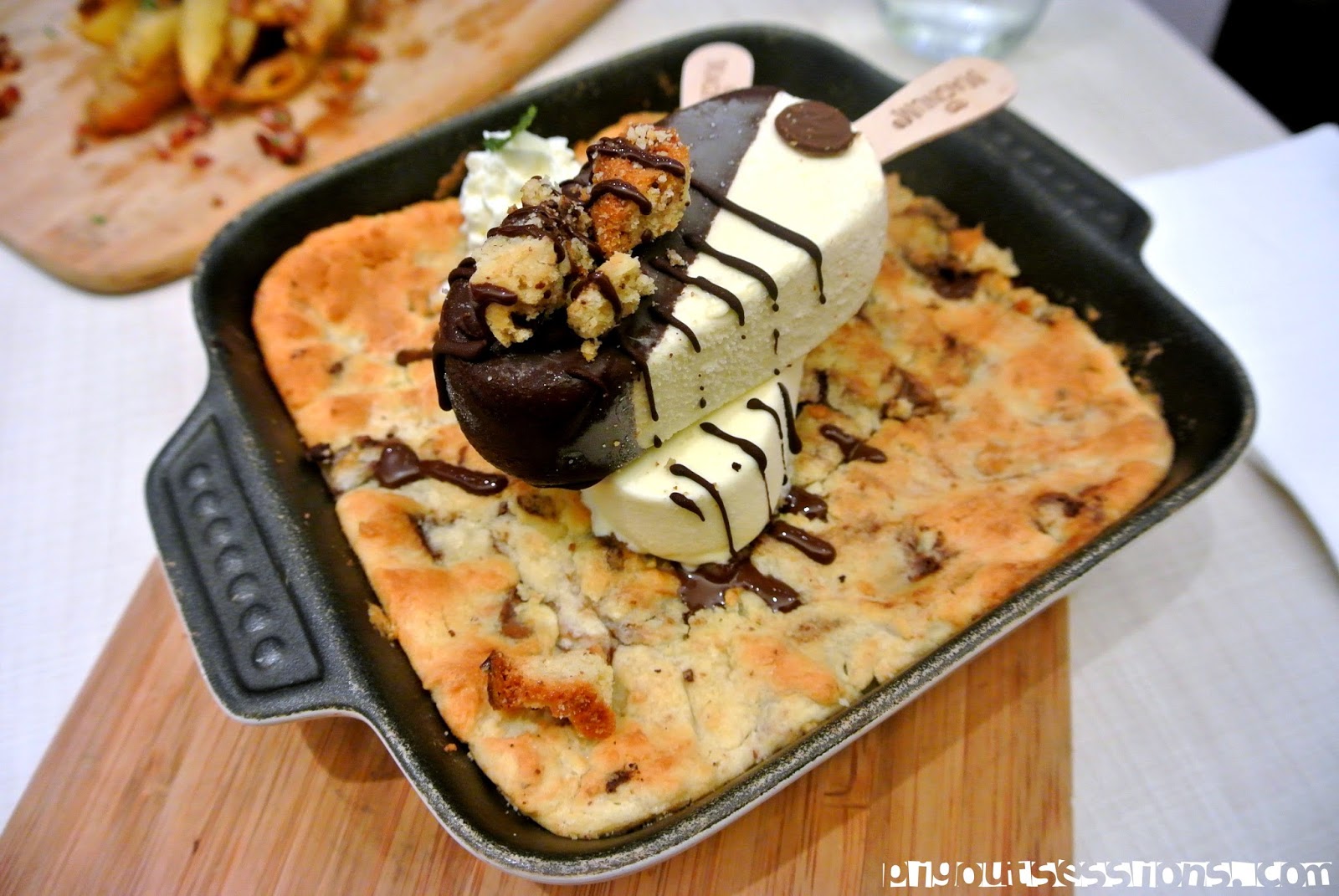 Cookie Dough Skillet 267.86PHP or 6.12USD. Fresh from the oven, this skillet covered with warm chocolate chip cookie dough, topped with 2 vanilla magnum bars that's drizzled with dark chocolate and chopped pecans takes me back to my happy place. We learned the hard way not to order anything else if you're intending to gobble this all up.