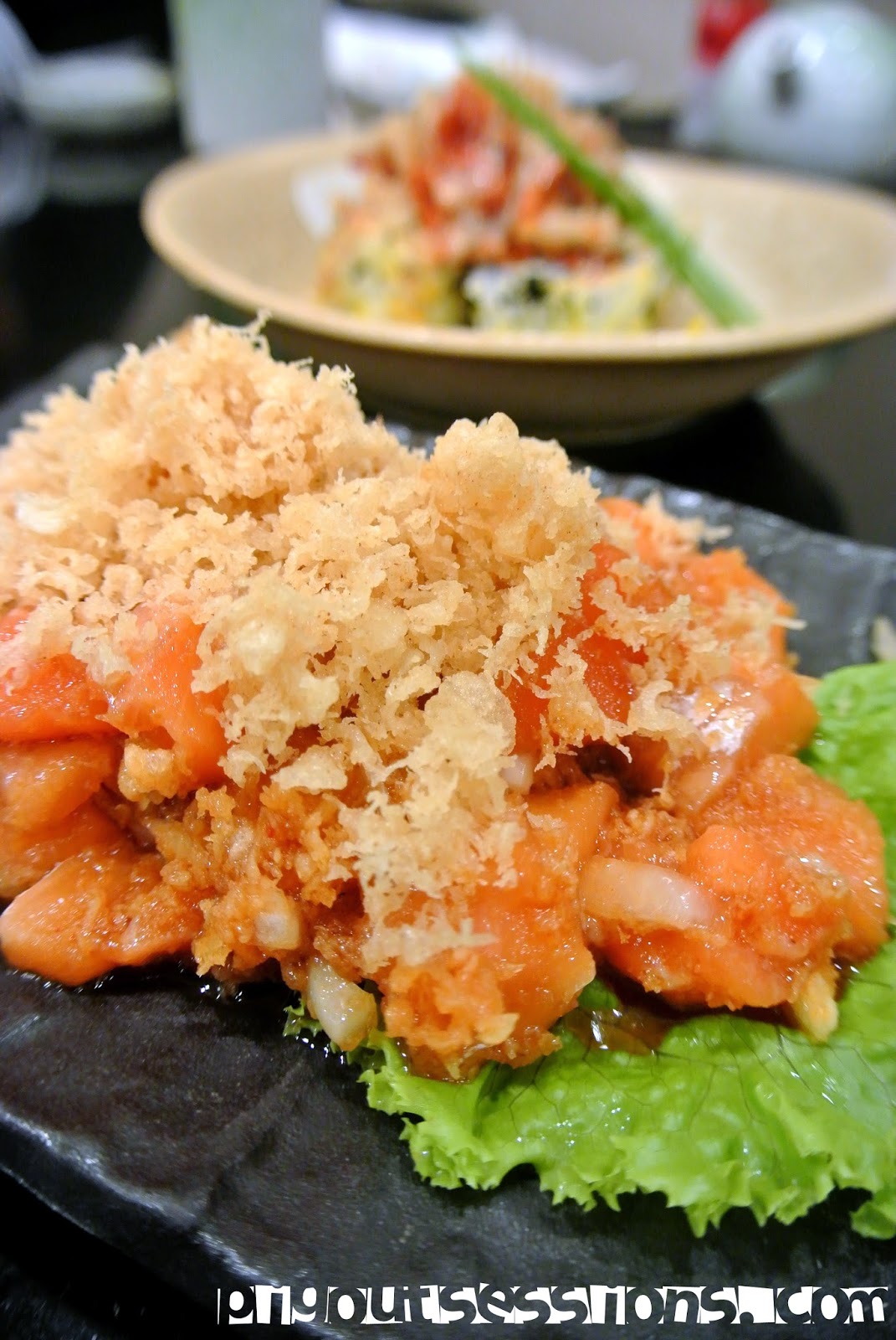 Shake Rayu Sashimi 375.00PHP or 8.54USD. Marinated salmon sashimi, topped with crispy tempura bits. I swear that if I didn't have a conscience, I would have polished this platter in seconds. My heart holds a special place for salmon and this dish has taken permanent residency.